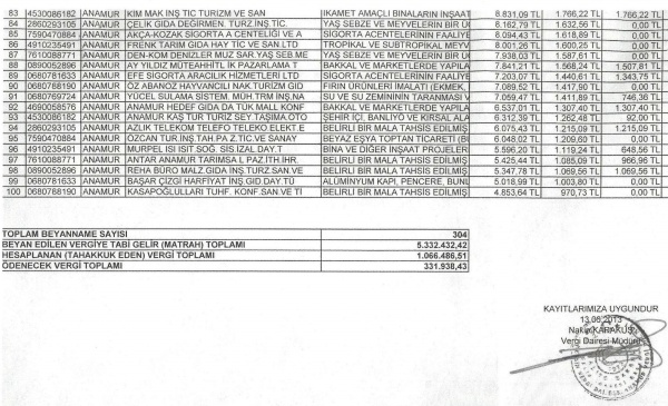 304 beyannamenin verildiği 2012’de beyan edilen vergiye tabi gelir toplamı 5 milyon 332 bin 432 lira oldu. 2012 vergilendirme döneminde hesaplanan vergi toplamı ise 1 milyon 66 bin 486 lira oldu.