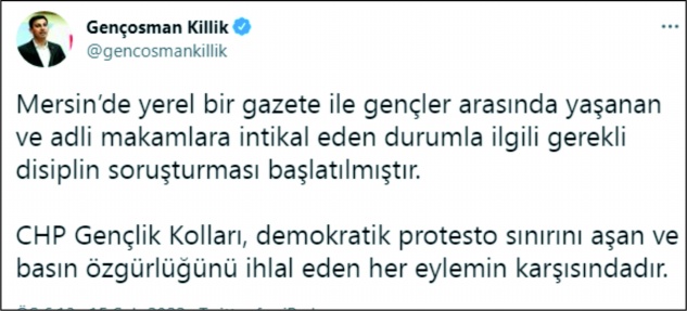 Killik, paylaşımında, “Mersin’de yerel bir gazete ile gençler arasında yaşanan ve adli makamlara intikal eden durumla ilgili gerekli disiplin soruşturması başlatılmıştır. CHP Gençlik Kolları, demokratik protesto sınırını aşan ve basın özgürlüğünü ihlal eden her eylemin karşısındadır” ifadelerini kullandı.