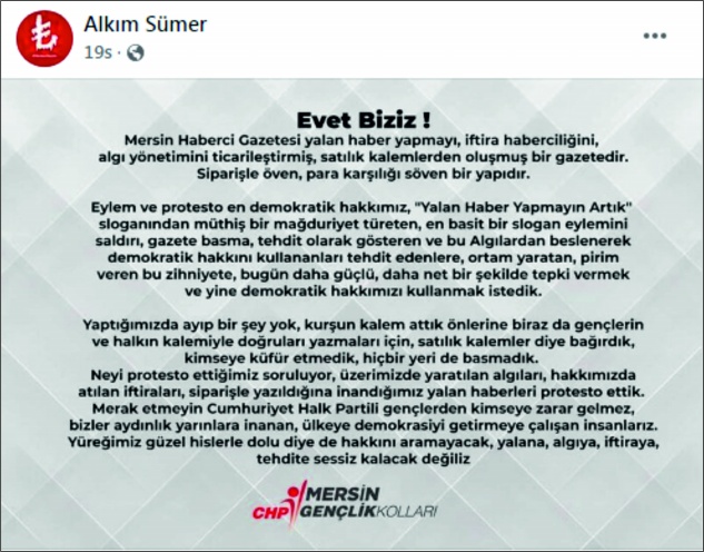 CHP Gençlik Kolları Başkan Yardımcısı İzzet Kırılmaz ve CHP Mersin İl Gençlik Kolları Başkanı Alkım Sümer de sosyal medya hesaplarından yaptıkları “Evet biziz” başlıklı açıklamada, yalan haber yaptıklarını iddia ettikleri gazeteye demokratik bir protestoda bulunduklarını belirttiler.