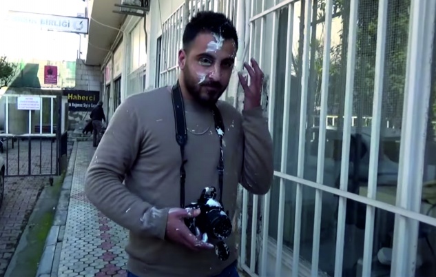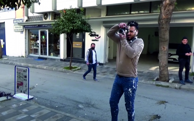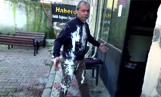Haberci Gazetesi Genel Yayın Yönetmeni Yüksel Ekici’ye boya atan grup, gazete ofisini çalışılamaz hale getirdi. Grubun attığı boyalar görüntü almaya çalışan gazete çalışanlarının üzerine gelirken, ellerindeki fotoğraf makineleri kullanılamaz hale geldi.